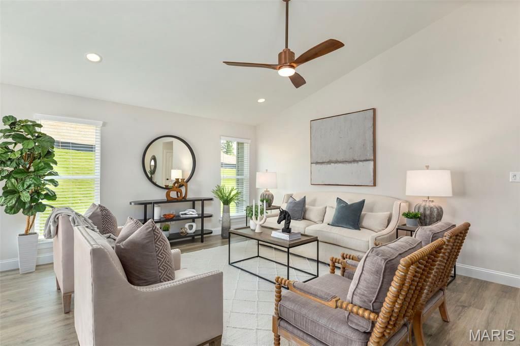 Hickory 3BR, 2BA ranch ready this summer by McBride Homes! This open floorplan features wood laminate flooring, vaulted ceilings & 6ft windows. The kitchen has level 4 Landen Burlap 42 cabinets, quartz countertops, stainless steel appliances & walk-in pantry. Spacious dining area w/sliding doors to the backyard. Great room has a ceiling fan & 2 windows for natural light. Primary suite has a large walk-in closet & private bath w/ double vanity, large tub w/window, walk-in shower, & linen closet. 2 additional bedrooms w/ ceiling fan prewires, plus hall bath & linen closet. Extras: 2 panel interior doors, main floor laundry, garage coach lights, matte black fixtures & 3/4 bath rough-in at LL for future finish. Valley View Farms offers beautiful new homes in Union, MO with easy access to shopping, dining, schools, and I-44 for convenient everyday living in Franklin County. Enjoy peace of mind with McBride Homes' 10 year builders warranty & incredible customer service! Display photos shown.